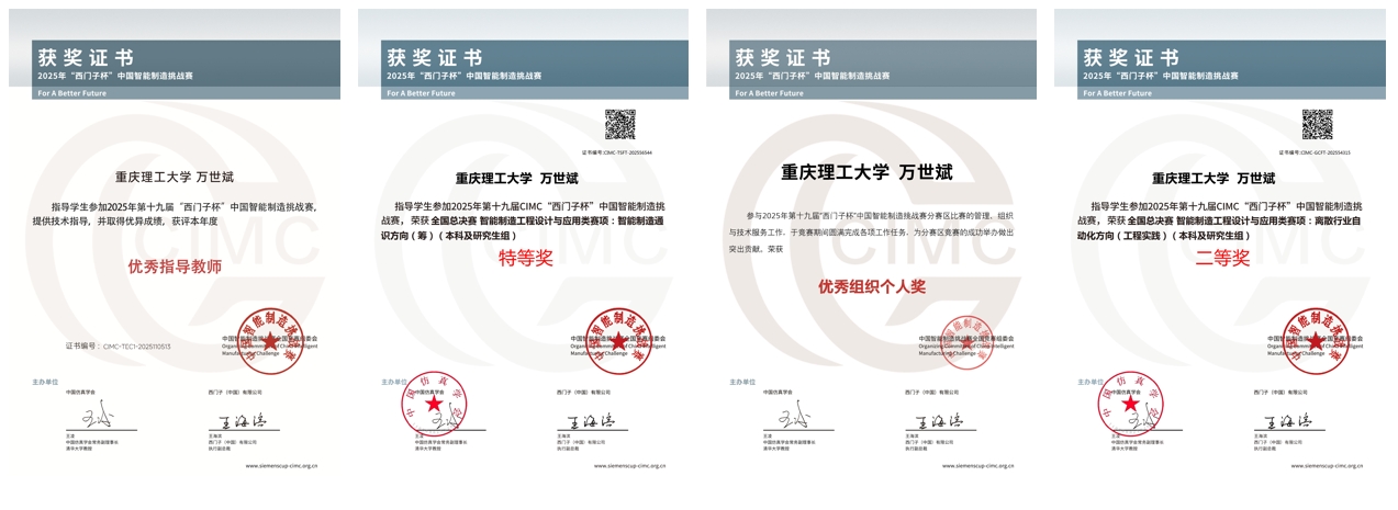 2025年8月15日,第19届CIMC“西门子杯”中国智能制造挑战赛全国总决赛在山西太原落幕。经过为期五天的激烈比拼,团队本科生凭借出色发挥,斩获全国总决赛特等奖1项,全国二等奖1项,万世斌副教授荣获2025年CIMC“全国优秀指导教师”,重庆理工大学被授予2025年CIMC“优秀组织奖”,创下团队参加该项国家级A类竞赛以来历史最佳战绩。此外,团队万世斌副教授还主要负责了第19届CIMC“西门子杯”中国智能制造挑战赛智能制造通识赛项西部五赛区暨重庆市市赛的组织工作,为表彰其在分赛区比赛组织中的突出贡献,全国组委会授予其“优秀组织个人奖”。